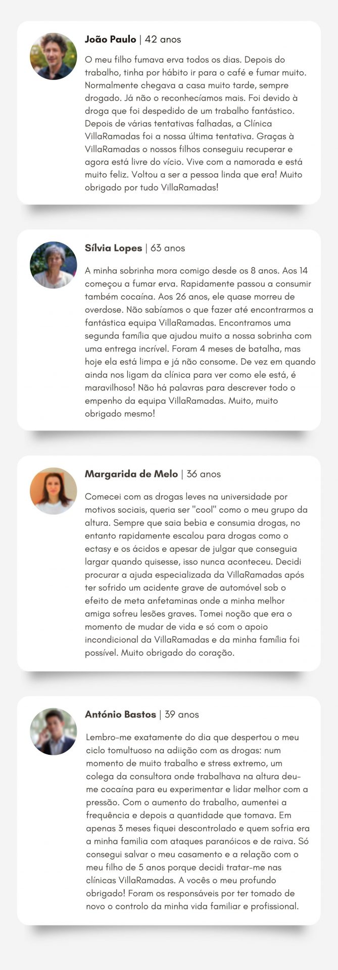 Não. A VillaRamadas dispõe de várias Clínicas Boutique para internamento em Portugal. Cada tratamento dura aproximadamente 4 meses. Após este período, o acompanhamento “After-Care” é realizado de forma híbrida, com sessões terapêuticas online e outras presenciais.